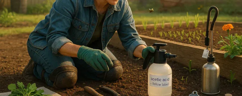 Start with label concentrations. For acetic acid, don’t improvise concentration: horticultural vinegar requires calibrated sprayers. Use flat-fan nozzles for uniform coverage: for spot sprays, cone nozzles help. Do test patches to confirm efficacy and minimize non-target damage.
