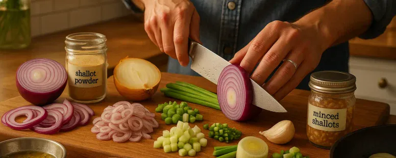 Keep jarred minced shallots in the fridge for quick use: they lose some brightness but hold well in cooked dishes. Frozen diced shallots work well for cooked bases: toss them in frozen. Shallot powder is shelf-stable and handy for dry rubs and sauces, rehydrate for salads. If you forget shallots entirely, use a small amount of sweet onion plus a drop of garlic oil for aroma.
