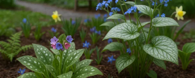 Pulmonaria gives immediate early-season texture with its spotted leaves and spring bells. Brunnera provides a bloom window just after Pulmonaria fades, extending visual interest through late spring. Use them together to create a staggered sequence of texture and color that keeps the shade bed lively.